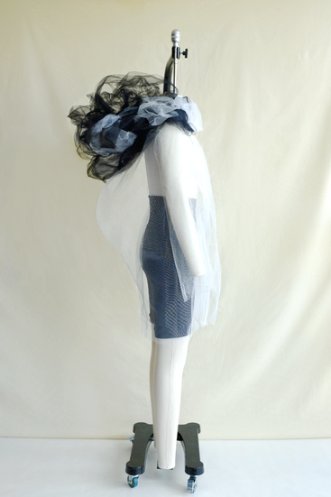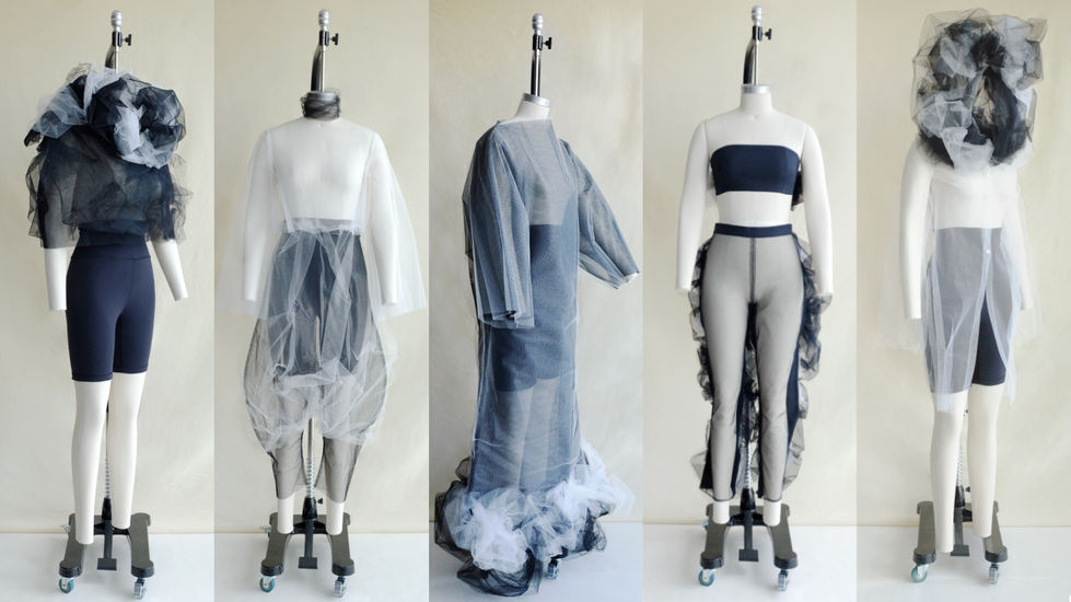 The collection consists of five simply-constructed outfits in the style of bedtime attire. Light and airy tulle and mesh are intertwined using hand-tacking techniques, randomly placed and deeply layered to emphasize the inescapable discomfort of troubled sleep.